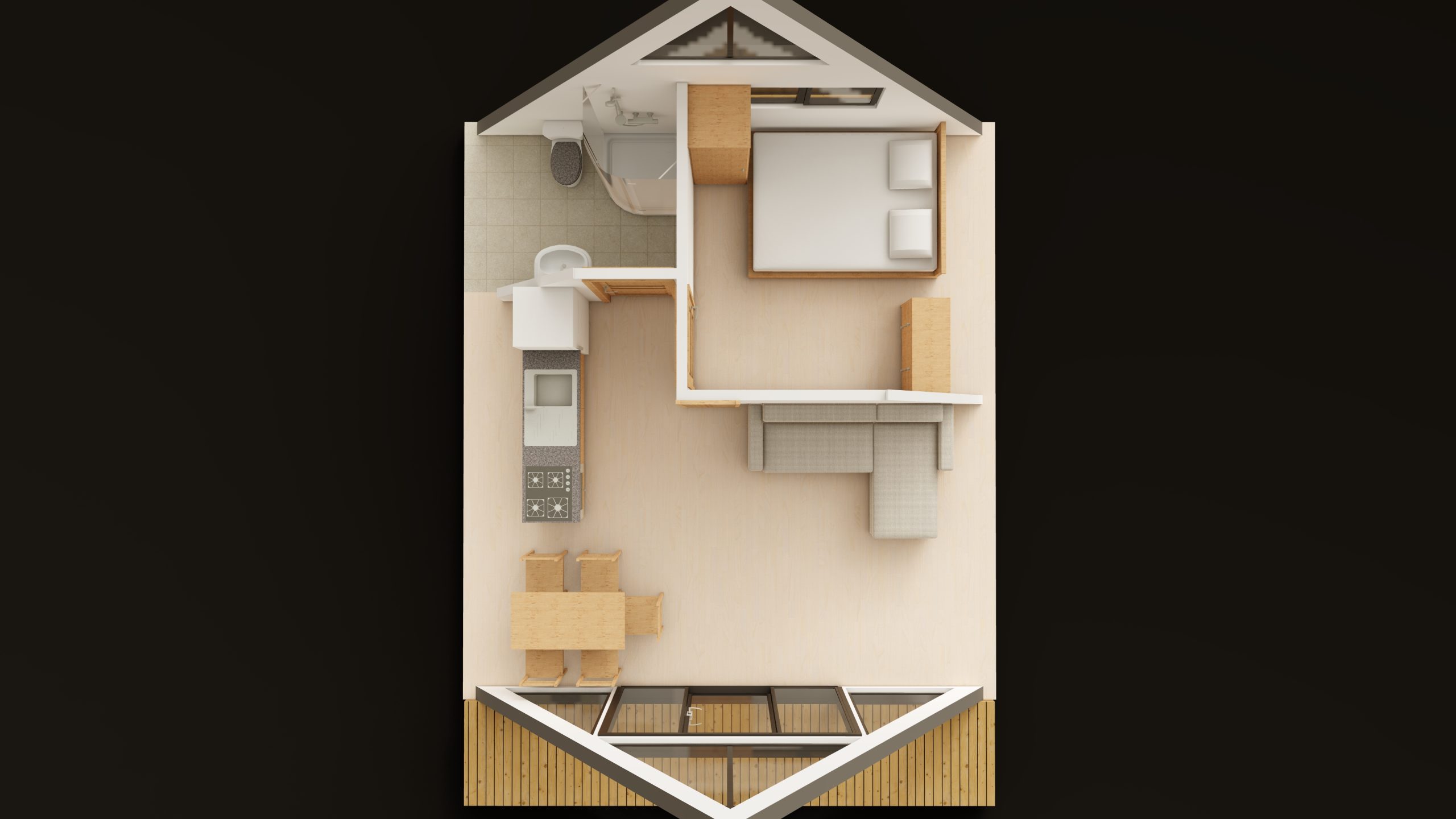 На першому поверсі зручно розміщується кухня-студія, санвузол і спальне місце, а мансардна зона — це ще один простір для сну або відпочинку.