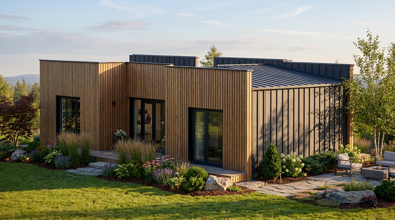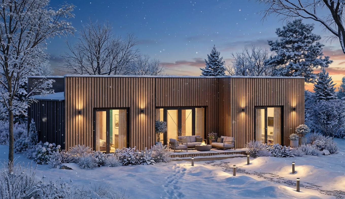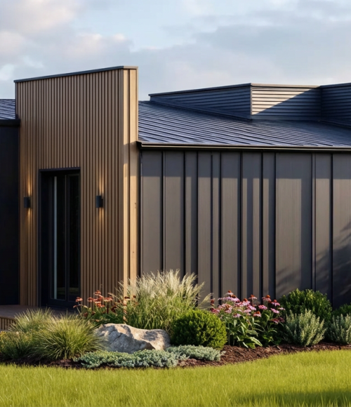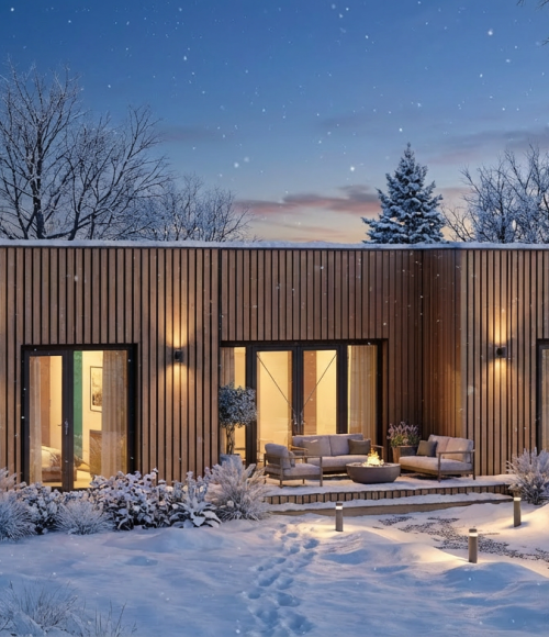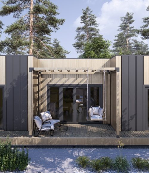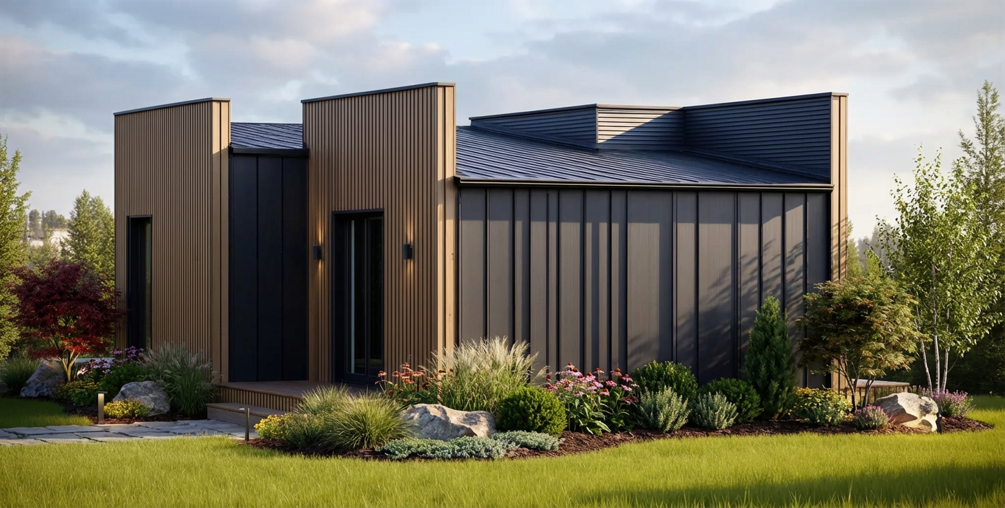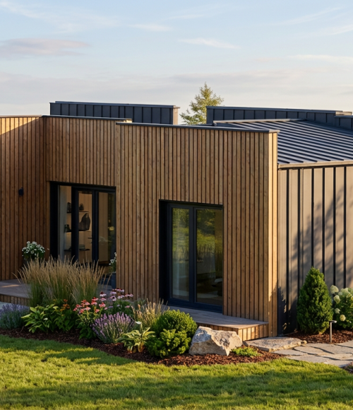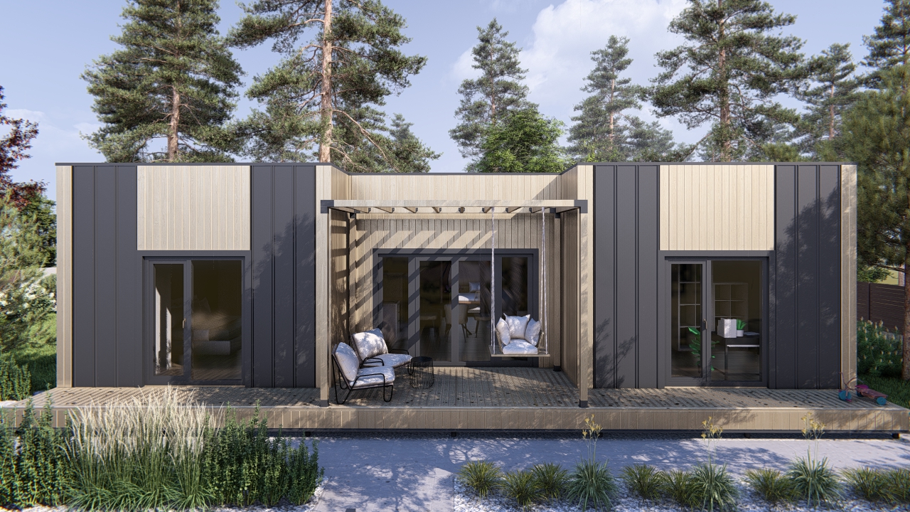 Флет Плюс поєднує стильний сучасний дизайн із практичністю. Мінімалістичний дах, панорамні вікна і чіткі лінії фасаду роблять будинок привабливим і водночас простим у монтажі.