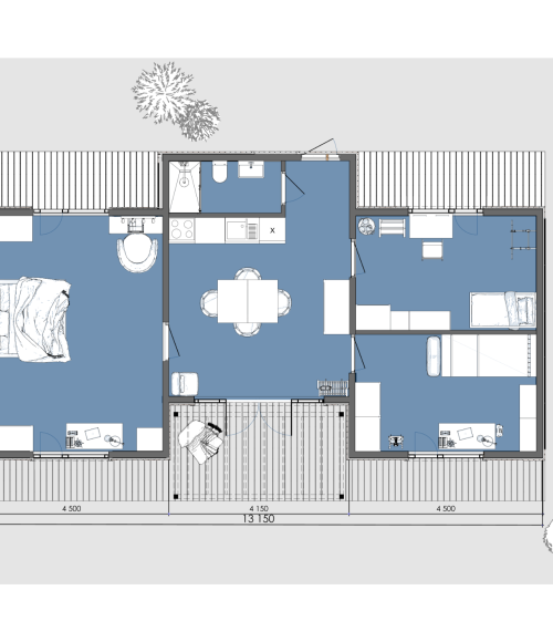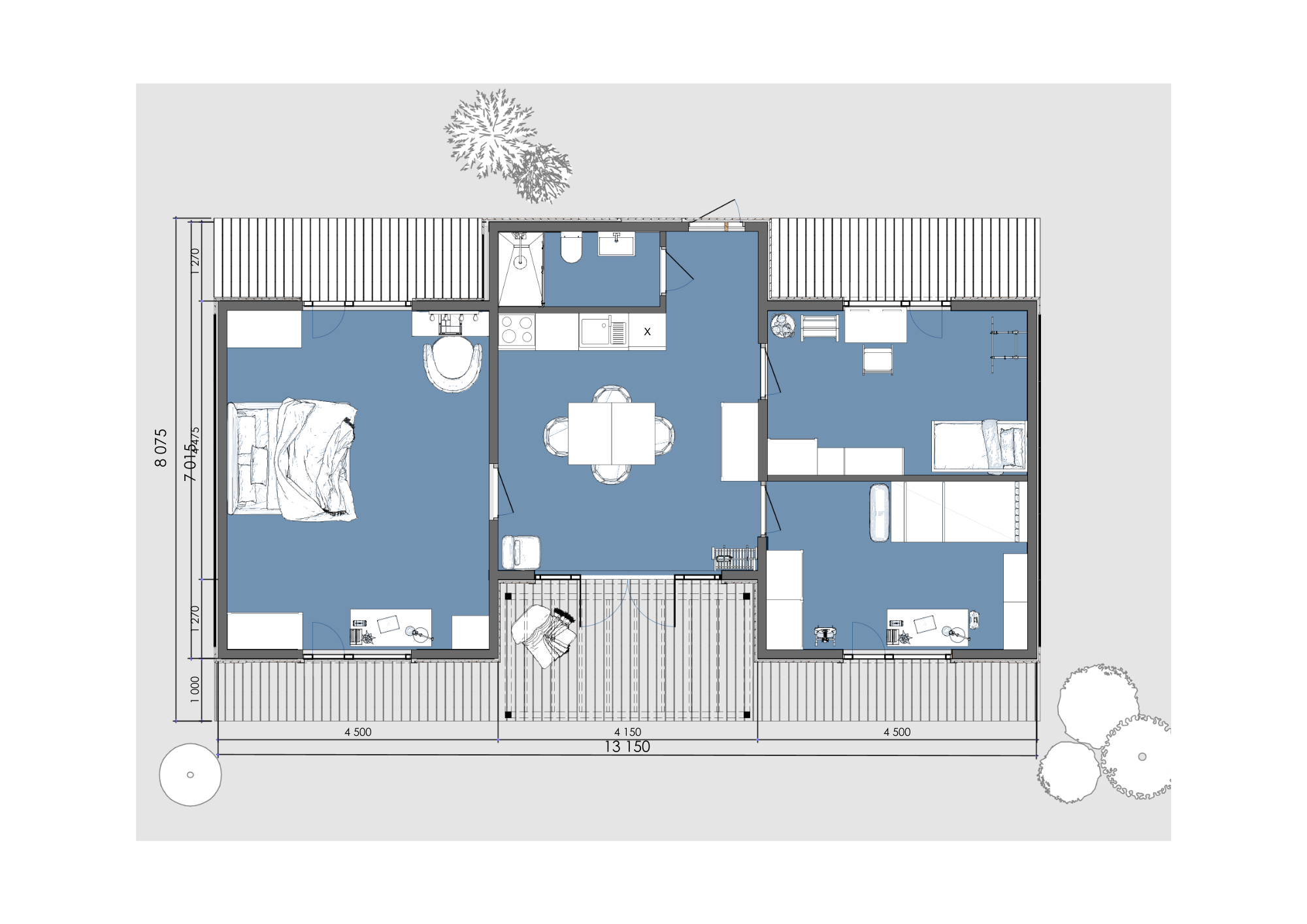 Цей будинок — оновлена версія нашого популярного Флет Хаус, у якій дзеркально додано третю секцію. Завдяки цьому площа збільшується до 86 м², а простір стає вдвічі комфортнішим та функціональнішим.