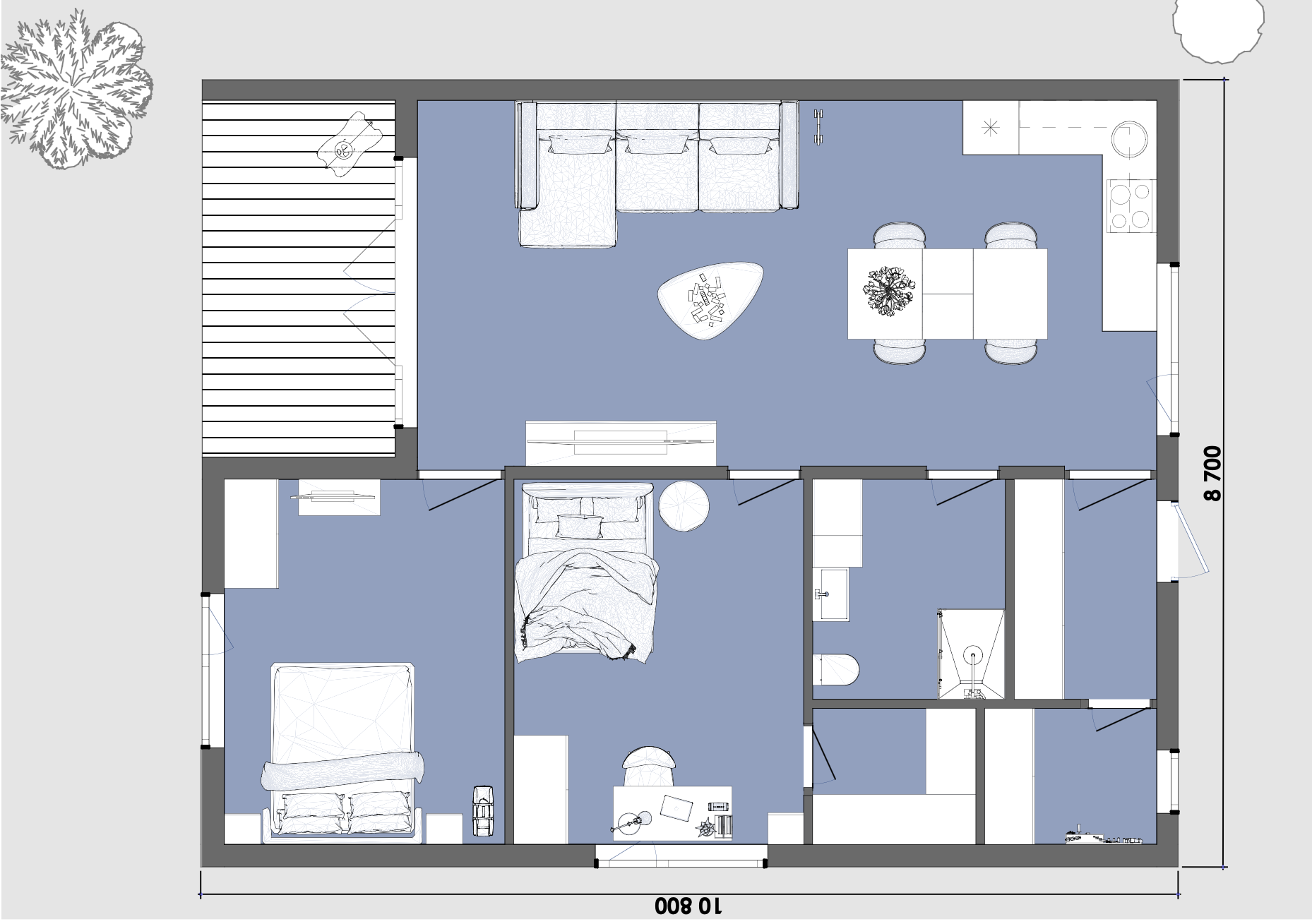 Це повноцінне житло площею 97 м², створене для тих, хто хоче переїхати ближче до природи, не втрачаючи комфорту міського життя. Габарити будинку — 11865×8725 мм, що дозволяє грамотно розмістити всі життєво необхідні зони.